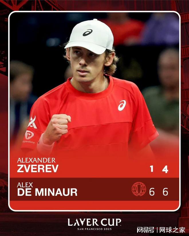 在早先结束的单打比赛中,欧洲队的兹维列夫以1-6 4-6不敌世界队的德米纳尔。兹维列夫的发球和正手均未找到节奏,而德米纳尔则凭借其无敌的跑动和稳定的防守反击控制了比赛。