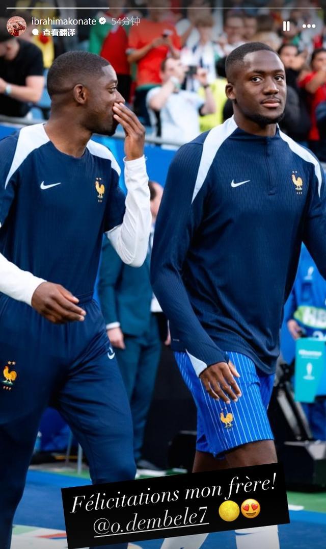 科纳特晒出了自己与登贝莱在国家队的合照,配文写道:“祝贺你,我的兄弟!”