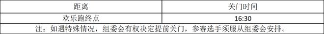 为了保证参赛选手的竞赛安全、顺利,竞赛期间竞赛路线设关门时间。在规定的关门时间内,未跑完对应距离的参赛选手须立即停止竞赛,退出赛道,以免发生危险。