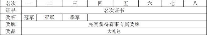 名次证书 + 冠军 / 亚军 / 季军奖杯 + 赛事专属奖牌 + 豪华大礼包