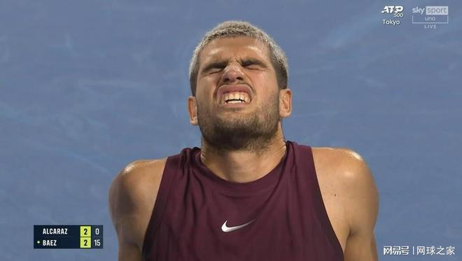 首轮对阵阿根廷新一代矮脚虎巴埃斯,第一盘第五局刚刚开始,风云突变。阿尔卡拉斯在跑动中扭伤了左脚,痛苦倒地。好在经过短暂的治疗和包扎之后,阿尔卡拉斯重新回到比赛中来,坚持打完了比赛,并以6:4 6:2的比分,两盘击退阿根廷新一代矮脚虎巴埃斯,仍然闯进了东京站第二轮。
