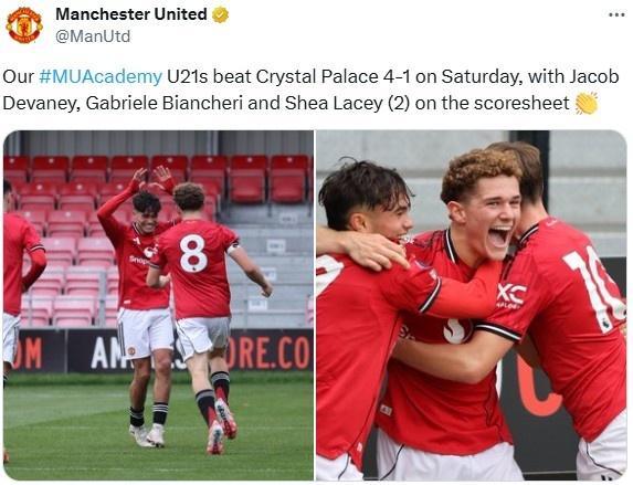 5战全胜!曼联U21队41水晶宫U21队,领跑联赛积分榜