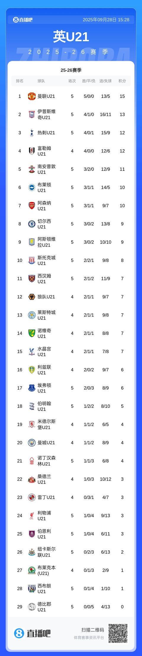 本轮战罢,曼联U21队在25-26赛季的5场联赛保持全胜,打进13球失5球,暂时领跑积分榜。