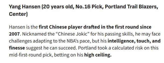 外媒评6大值得关注新秀:杨瀚森上榜开拓者赌的就是他的高上限