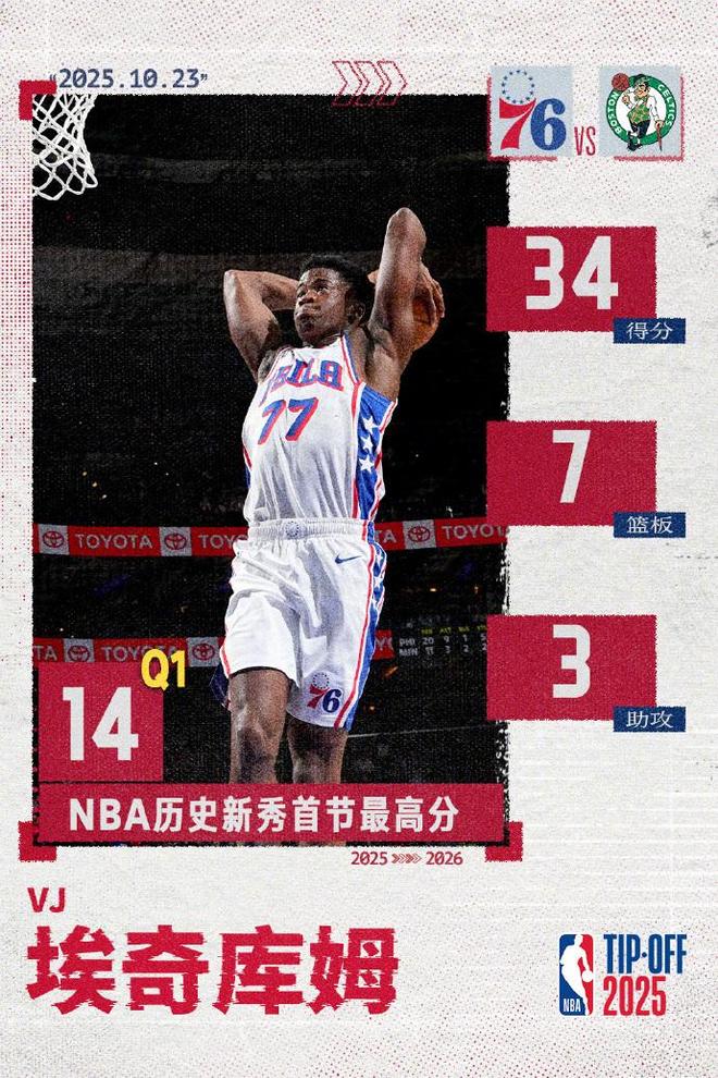 探花埃奇库姆首秀34+7闪耀成为最佳新秀热门76人探花秀埃奇库姆领跑新秀得分榜,他目前只打了一场比赛,在揭幕战1分险胜凯尔特人的比赛,恩比德9中1梦游,但埃奇库姆站出来与马克西组成双枪闪耀。在马克西狂轰40分之外,埃奇库姆狂轰5记三分,贡献34分7篮板3助攻1抢断表现惊艳。埃奇库姆首节14分超越詹姆斯的12分,创造NBA球员首秀首节得分纪录,且全场34分创造21世纪新秀首秀得分榜第一纪录,其余21世纪新秀首秀无人得分达到30分,2002年的吉里塞克29分位列21世纪新秀首秀得分榜第二。埃奇库姆接下来的比赛,能否延续他首秀的表现还是未知数。不过从夏季联赛到季前赛,再到揭幕战的表现,20岁的埃奇库姆展现出少年老成的特质,成为最佳新秀的热门人选。