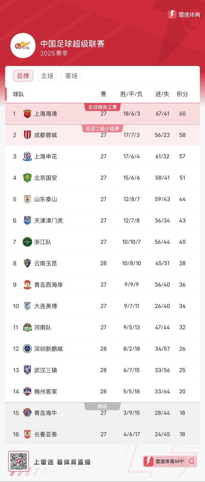 - 中超 | 中超保级形势:三镇、新鹏城基本无忧,梅州或被海牛亚泰超越