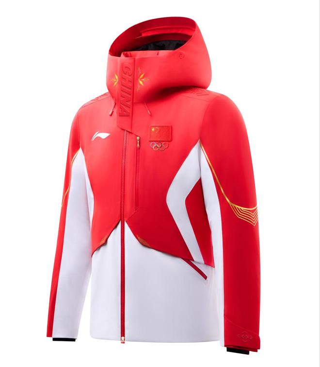 2026年米兰冬奥会中国体育代表团领奖装备,以红、白两色为主色调, “中国红”充分彰显中国文化元素,在正面勾勒出象征着五角星的线条;“雪山白”灵感源自冬季运动场景,也融入了东方审美里的留白意境,并在侧身勾勒出李宁品牌标识线条,同时搭配以雪道为原型的金色流线型线条为点缀,全身以上红下白的色彩拼接,凸显中国运动健儿的挺拔身姿。