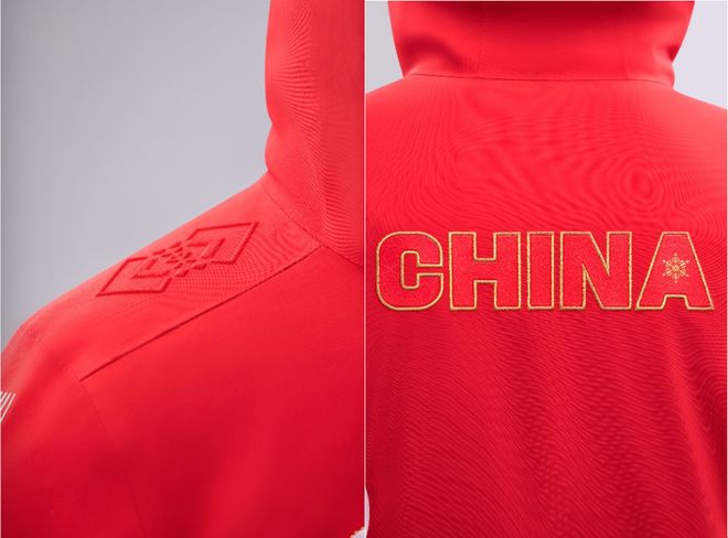 领奖服在肩部、袖口等部位采用了传统吉祥寓意纹样——“双胜纹”,纹样由两个菱形交叠穿插而成,寓意胜利、祥瑞,并在此基础上衍生出“双胜雪花纹”。领奖服背后CHINA字母纹饰,在夜晚光照后也能清晰可见。