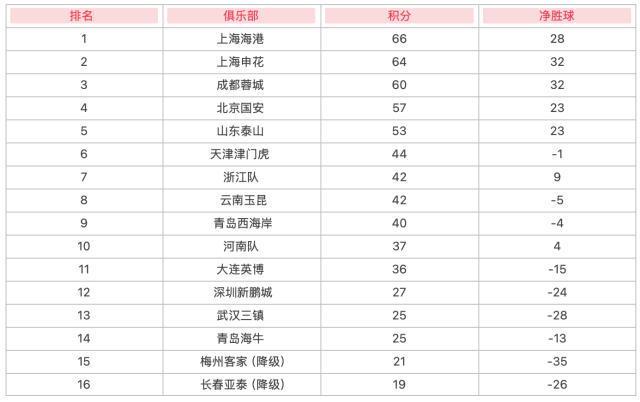- 中超 | 中超30轮积分榜:海港积66分夺冠梅州亚泰降级