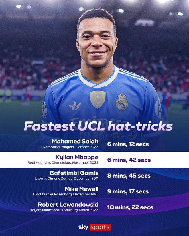 在周四凌晨欧冠联赛阶段第5轮比赛中,皇马客场4-3击败奥林匹亚科斯,其中姆巴佩打进4球,完成大四喜,并在6分42秒内打进了本场比赛个人的第三个进球。
