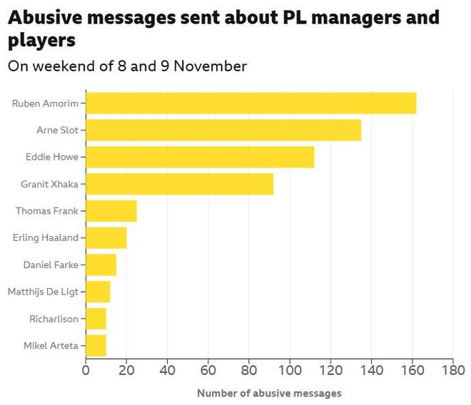 英媒调查:英超第11轮期间阿莫林、斯洛特遭最多网络攻击